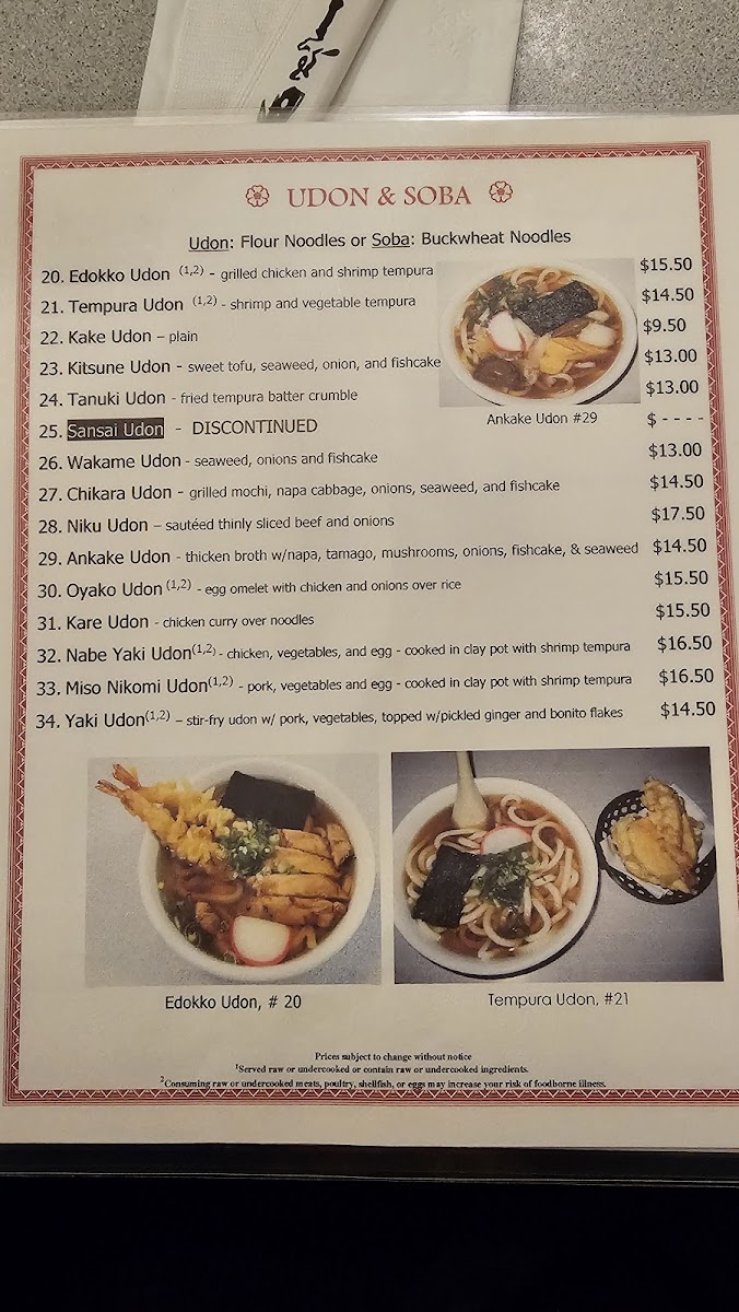 Patrons can find a variety of dishes ranging from soup-based favorites like Miso Nikomi Udon, to shareable appetizers such as Gyoza and Yakitori skewers. The menu includes familiar items like Chicken Katsu and California Rolls, alongside unique takes like the Challenge Ramen or Edokko Chahan fried rice. Complement your meal with traditional drinks such as Hot Green Tea or Sake to complete the experience.